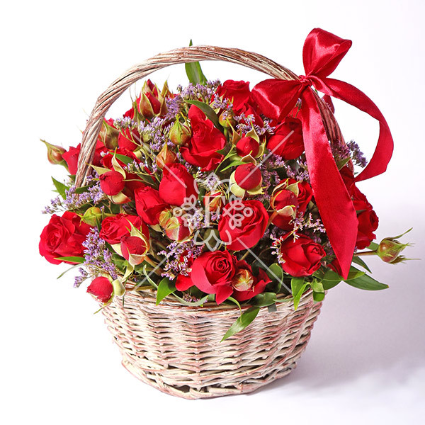 роза красная кустовая 11 шт., лимониум, декоративная зелень, оазис, корзина малая, лента